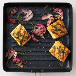 - Durable, heavy-duty aluminum base browns and sears faster at lower temperatures
