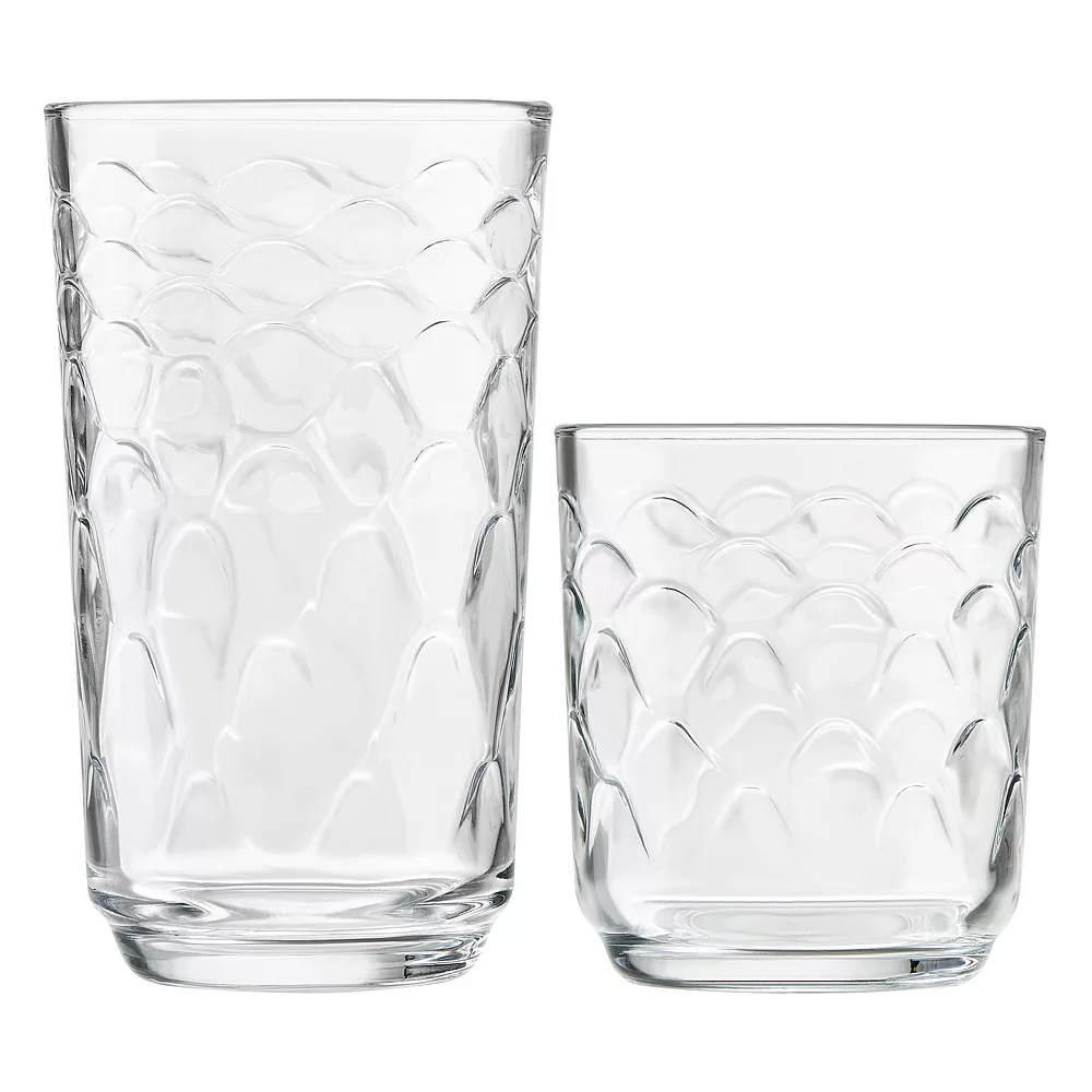 - Eight 18-oz. cooler glasses & eight 11.2-oz. double old-fashioned glasses